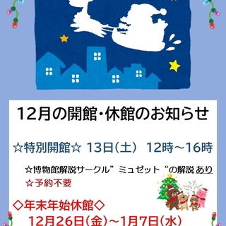 13日(土)は12時~16時まで開館いたします。ご見学予約不要。館内で博物館解説サークル"ミュゼット"の解説が行われます。