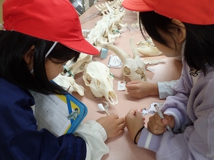 本物の骨格標本を見て、先生と一緒に確認し、集中力は途切れることがありません。