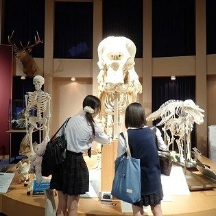 展示室に足を一歩踏み入れた瞬間、「わあっ!すごい!!」と声もあがり、骨格標本を初めて見たという生徒さんは「これも本物ですか?あれも本物ですか?」と興味溢れる様子が感じられました。