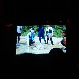 前半は、マゼランペンギンに装着したデータロガーに映し出された水の中の映像をご覧いただき、バイオロギングという研究手法についての詳しいお話しがありました。海の中の小さなイワシの間を泳ぐペンギンの目線はものすごいスピード感、今までに見たことのない水中の映像に、参加された皆さんは瞬きをする僅かな時間もありません。また、南米パタゴニアでの調査の様子や、データロガーを装着するために動物を捕獲する様子、動物にストレスがかからないように手際良く装着し、放すという一連のお話しも、とても興味深いものでした。
