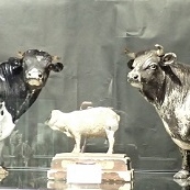 これによると、家畜の模型標本は遺伝学や映像技術が未発達であった時代には、家畜の品種改良にとって極めて重要であり、模型の体型を見ながら品種改良をしたということです。それだけ重要な標本は初期には欧州から輸入していましたが、その後国産品も作られるようになりました。それらが伝統ある博物館に収蔵されており、木村先生はこれを調べてその経緯や意義を論じておられます。当館の模型標本は残念ながらラベルが残っていないため出自は不明ですが、造形的には非常に優れたもので、輸入品であると推察されます。これらの模型標本は展示室に展示してありますから、じっくり眺めていただきたいと思います。